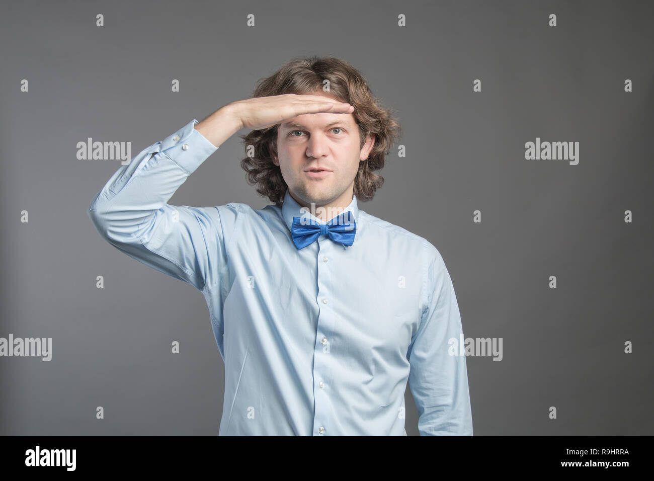 Handsome Young Man With Dark Curly Hair Wearing Blue Shirt And Bow Tie Putting Hand On His Forehead And Smiling Looking Far Isolated On Grey Backgrou Stock Photo Alamy